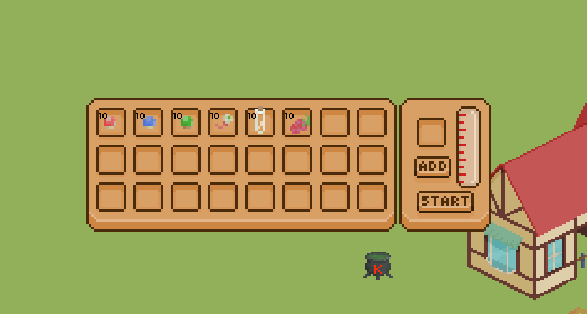 First, the player can open the “Tank”. The tank is the first brewing machine in the process. Here you add your base ingredient, and the tank is automatically filled with water. The tank brews for a bit and creates a “wash” or “wort” (haven’t decided yet). This wash is the base for your potion, and the base ingredient is responsible for the modifier of the potion effect.