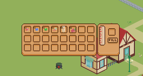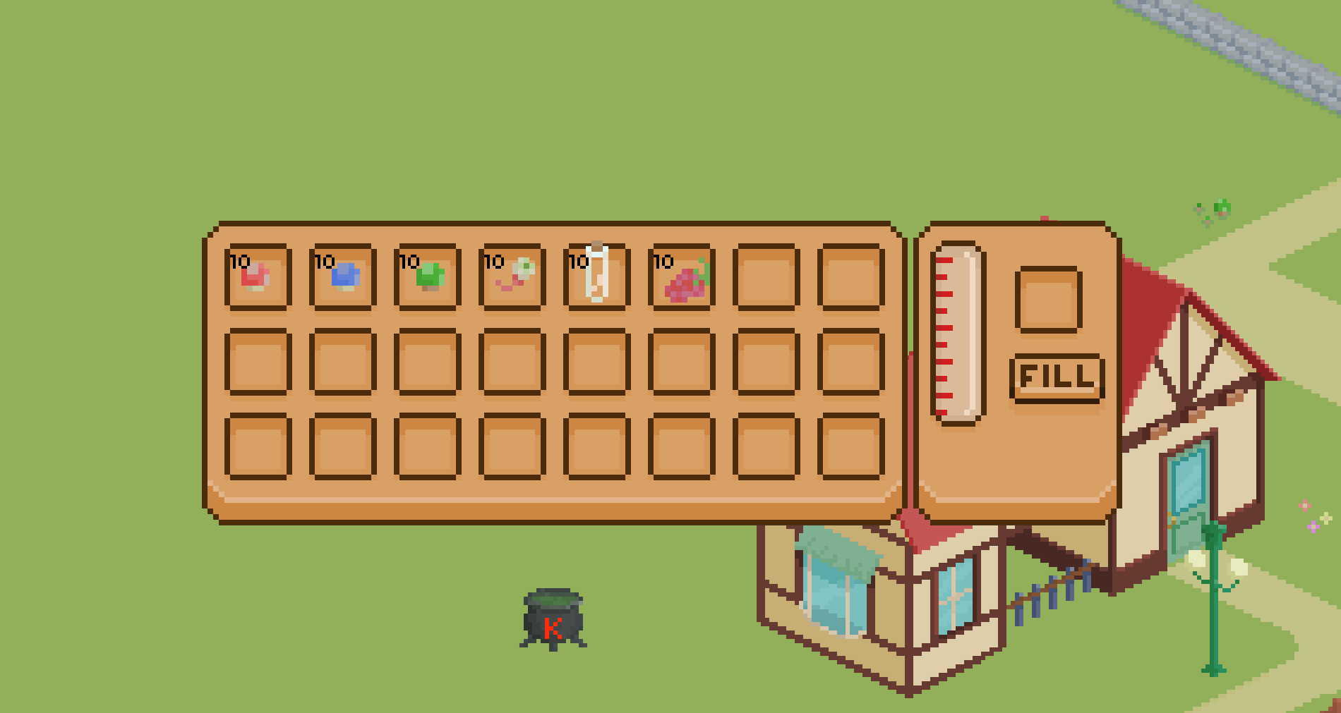 Once the kettle finishes up, the kegs take over. The keg is pretty straight forward, the brew is transferred into it and it immediately begins aging the potion with special magic wood. There’s a lot of unknowns about this part of the process, so I’ve left it simple to act as a template for future features. When the keg is done doing its magic, the player can use its interface to fill bottles and get actual usable potions!